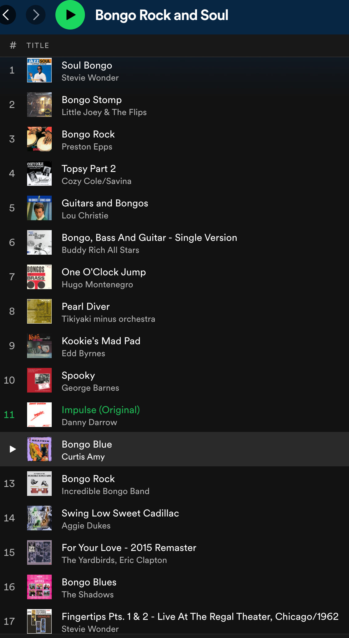 "Bongo Rock," an instrumental, by Preston Epps. The 1959 British beatnik movie drama, "Expresso Bongo," starring Laurence Harvey, featured an explosive scene in a club, Cliff Richard playing bongos on the dance floor while his band, the Shadows, plays surf music on stage. Though Richard released an Expresso Bongo EP in the U.K., the only version I could find on Spotify was on a Shadows collection, and it seems like the bongos had been deleted from the tape.